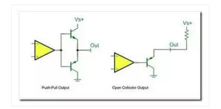 該圖中左邊的便是推挽輸出模式,其中比較器輸出高電平時下面的PNP三極管截止,而上面NPN三極管導(dǎo)通,輸出電平VS+;當(dāng)比較器輸出低電平時則恰恰相反,PNP三極管導(dǎo)通,輸出和地相連,為低電平。右邊的則可以理解為開漏輸出形式,需要接上拉。