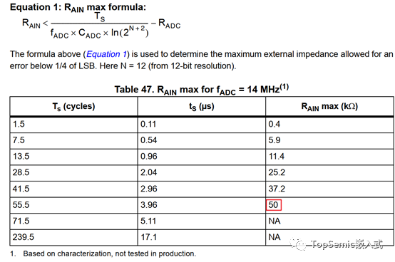 Tab 46標(biāo)稱的最大輸入阻抗50kΩ,是在ADC時(shí)鐘頻率14Mhz,采樣周期55.5 cycles,轉(zhuǎn)換位數(shù)12時(shí)計(jì)算出來的值,它同時(shí)也是ADC模塊所能接受的最大值 (受硬件決定,這也是為什么Tab 47最后兩行寫NA的原因,雖然根據(jù)公式也能算出來一個(gè)比50更大的值)。