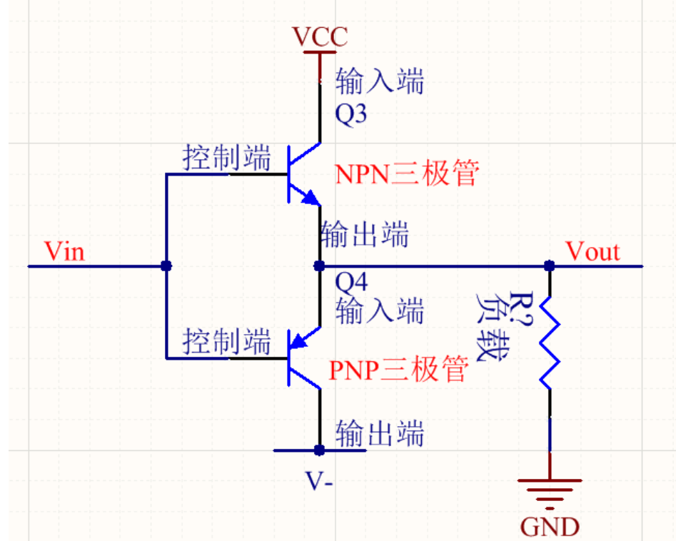 經(jīng)過(guò)上面的N型三極管提供電流給負(fù)載R,這就叫「推」。