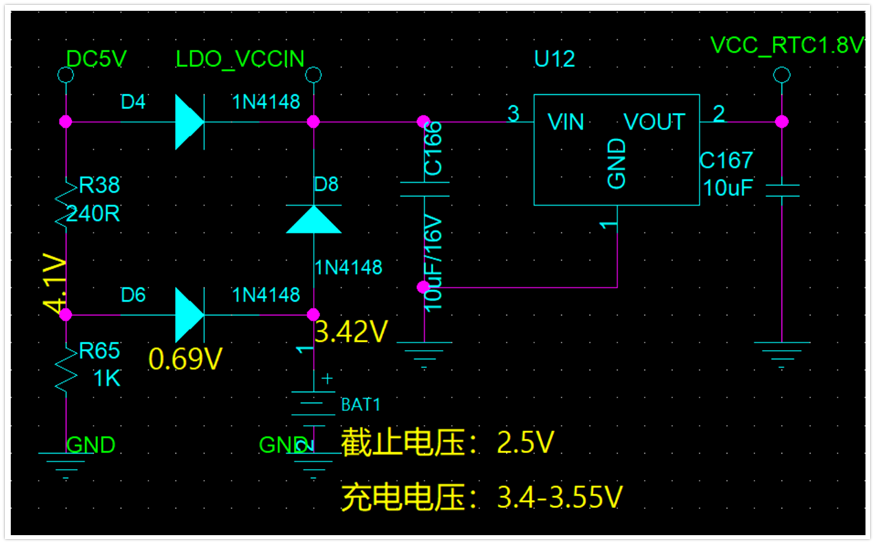 用5.2V的原因是,源電路已經(jīng)將電壓調(diào)高到5.2V。充電電壓滿足后,就能正常充電。5.2V同時(shí)給U12轉(zhuǎn)換一個(gè)1.8V給RTC供電,也就是在主電源沒斷電的狀態(tài)下,LDO_VCCIN的電壓電壓高于D8輸出的電壓,此時(shí)D8是截止的,放不出電,但是主電源沒電的狀態(tài)下,充電電池就從D8輸出給U12,達(dá)到送到RTC供電的目的,原理已經(jīng)講明白了,下面說一下知識(shí)點(diǎn)。