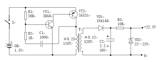 如圖所示是一種構(gòu)造很簡(jiǎn)單的小型直流升壓器,可用來(lái)取代15V的疊層電池。電路的核心元件一變壓器T使用的是袖珍驗(yàn)鈔器的專用變壓器。電路耗電約40mA,輸出電壓為15V。如果萬(wàn)用表15V電池的正極與1.5V電池的負(fù)極相接,只需將圖7—70中VD1(C1、VDZ的極性調(diào)過(guò)來(lái),這樣將輸出一個(gè)-15V電壓)