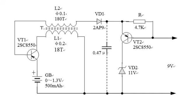 如圖所示是一種利用1.2V、500mAh的鎳鎘電池做電源的逆變電源電路,輸出直流電壓為9V,可供數(shù)字式萬(wàn)用表使用。下圖中變壓器T利用15mm的磁環(huán)穿繞而成(元器件參數(shù)圖中均已標(biāo)注人名為數(shù)字萬(wàn)用表的電源開(kāi)關(guān)。